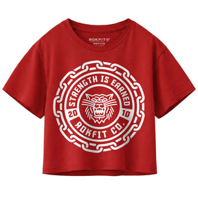 A striking tiger and chain badge design on a rich red crop top. Strength Is Earned. Nobody hands you results. Every ounce of power, endurance, and resilience is paid for daily in sweat, discipline, and iron.